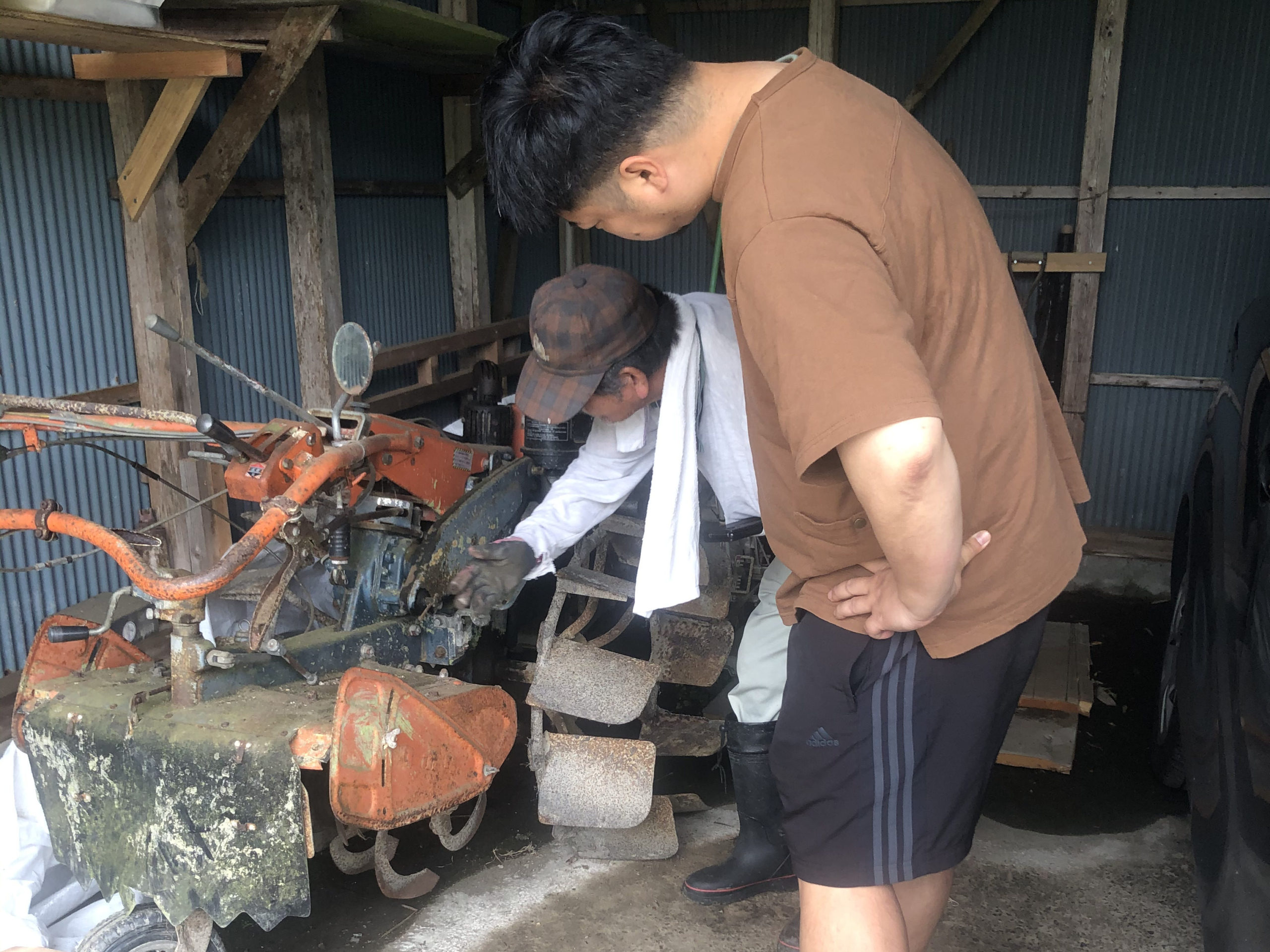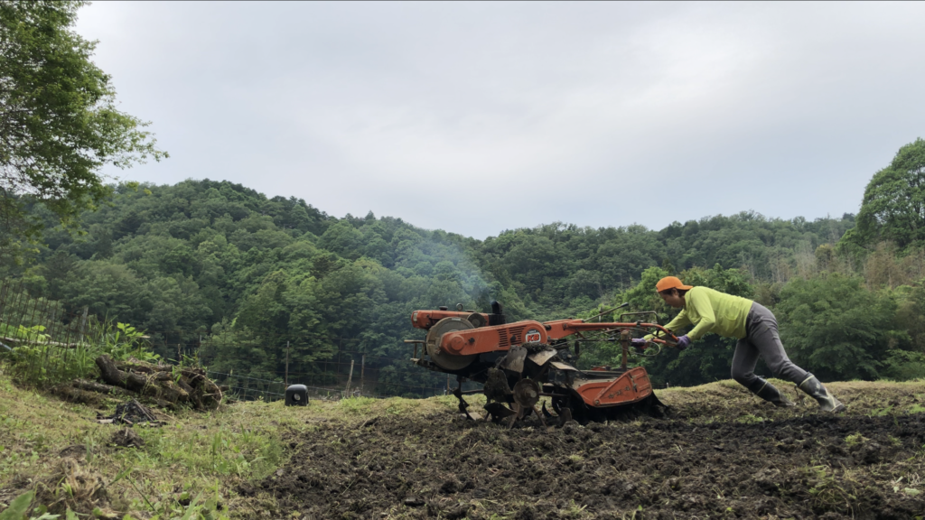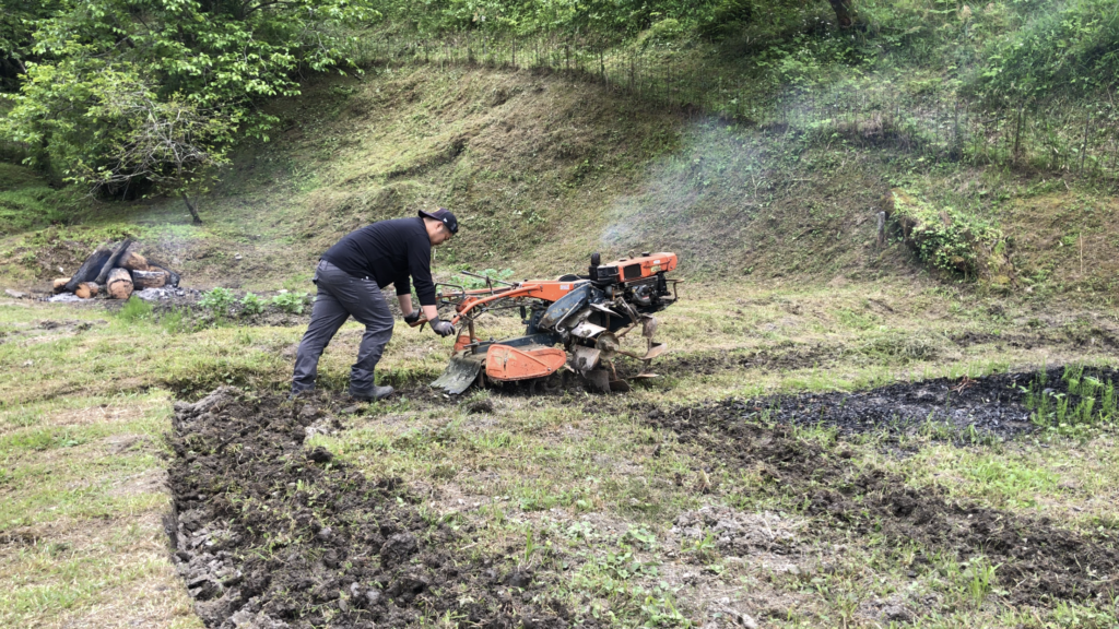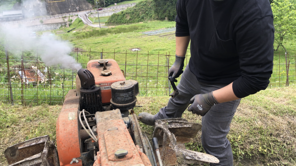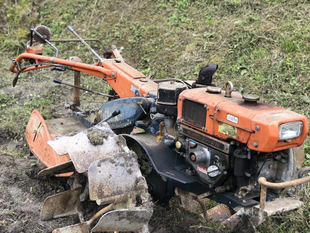 年代物の耕運機使って畑を耕す
